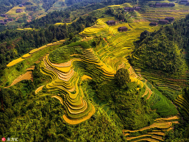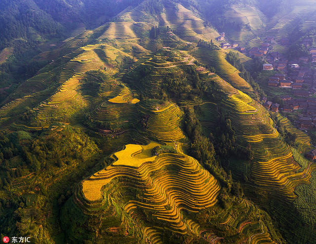 航拍金秋的广西龙胜龙脊梯田,漫山铺金,层层梯田若级级金阶,美不胜收。