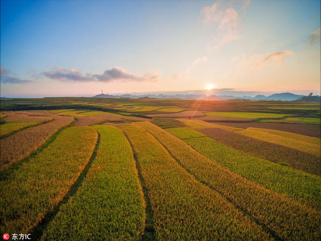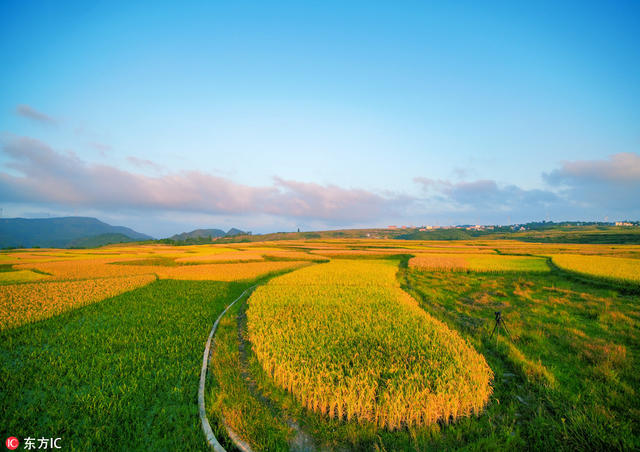 贵阳花溪,无人机在金色田野间穿梭,高空远眺波光荡漾的稻田,满目金色,一望无际的梯田稻浪滚滚,层层田坎就像作曲家笔下的“五线谱”,田间行走的农夫如跳跃的音符,秋韵十足。