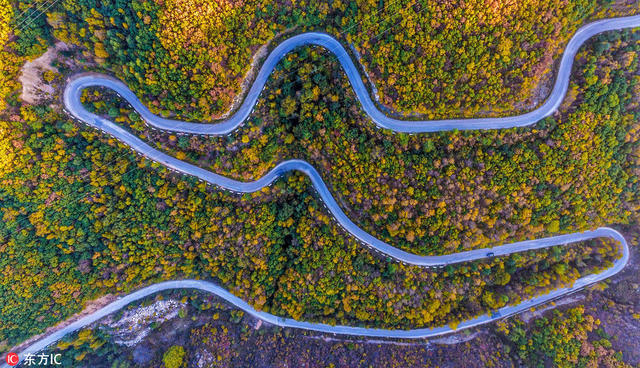 航拍北京喇叭沟门原始森林。大片美景披上彩色的妆容,正在静静地等待快门声,远山、平原着上不同的颜色,深绿、浅黄、枫叶红交织着出现,那茂密的植被因为海拔高度的差异、向阳背阴的区别呈现出不同的色调。夕阳照在山峦,明亮的脊线如一道道彩练,阳光穿透杂树,红黄青绿明暗益彰,远远看去就像是造物主不小心打翻了调色板,浓重地涂抹在山间、湖畔和原野。