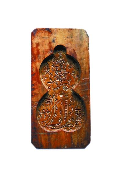 这款民国制作的较为特殊的异形月饼模具“福禄同喜”,是于进江在多年前从一位藏家手中“换得”的。而交换的筹码是当年还被视为“稀有品”的手机。葫芦纹样在古代备受推崇,但是作为异形葫芦的月饼模具却极为难得。而在纹样的选取上,一般是“喜”字、“寿”字和“玉兔”,单独的嫦娥玉兔却很少见。不同于传统的技艺,这块模具将仕女图的绘制技法融合其中。可见,在小小的一块模具上也大有乾坤,无论是民间艺术品还是大师佳品,都是多元艺术元素融合的结晶。