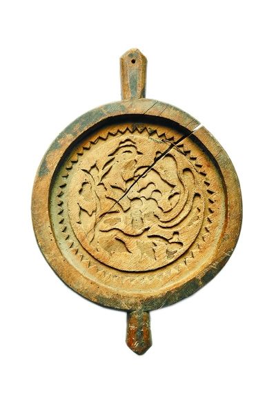 “凤穿牡丹”是月饼模具中的一件难得的佳品,是于进江在旧货市场一堆老家具当中偶然发现的,模具上落满灰尘,有些裂纹。其造型独特,具有双把手形式。这种样式在宋元时期比较多,明代以后就少了。此款是明嘉靖年间的作品,雕刻风格简洁明快。画面中的凤凰在太阳的光芒下活灵活现。凤穿牡丹的纹样在明代早期的瓷器、服饰上较为流行。在这件模具上还留有墨迹题刻,记录主家的姓氏、制作时间。可见在传统月饼的制作上,也有为家族手工定制的。现如今,月饼制作很少再沿袭手工的习俗,月饼模具也离开了人们的视线。