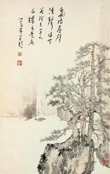 除了临摹、学习在绘画史中被称为北宗山水的画风外,南宗文人画风更是溥儒关注的重点。近景就类似于李成、郭熙画中用卷云皴及蟹爪枝绘制的山石与松树,但是这种特写镜头或放大式的取景更像元代的李郭派(如唐棣)的画风,而山石的画法更类似于周臣、唐寅惯用的皴法。中景留白来表现溪流,雾气中的远山与瀑布显示了远景与中景的距离之远,在某种程度上,《白云溪声图》可以说又具有倪瓒的“三段式”构图。